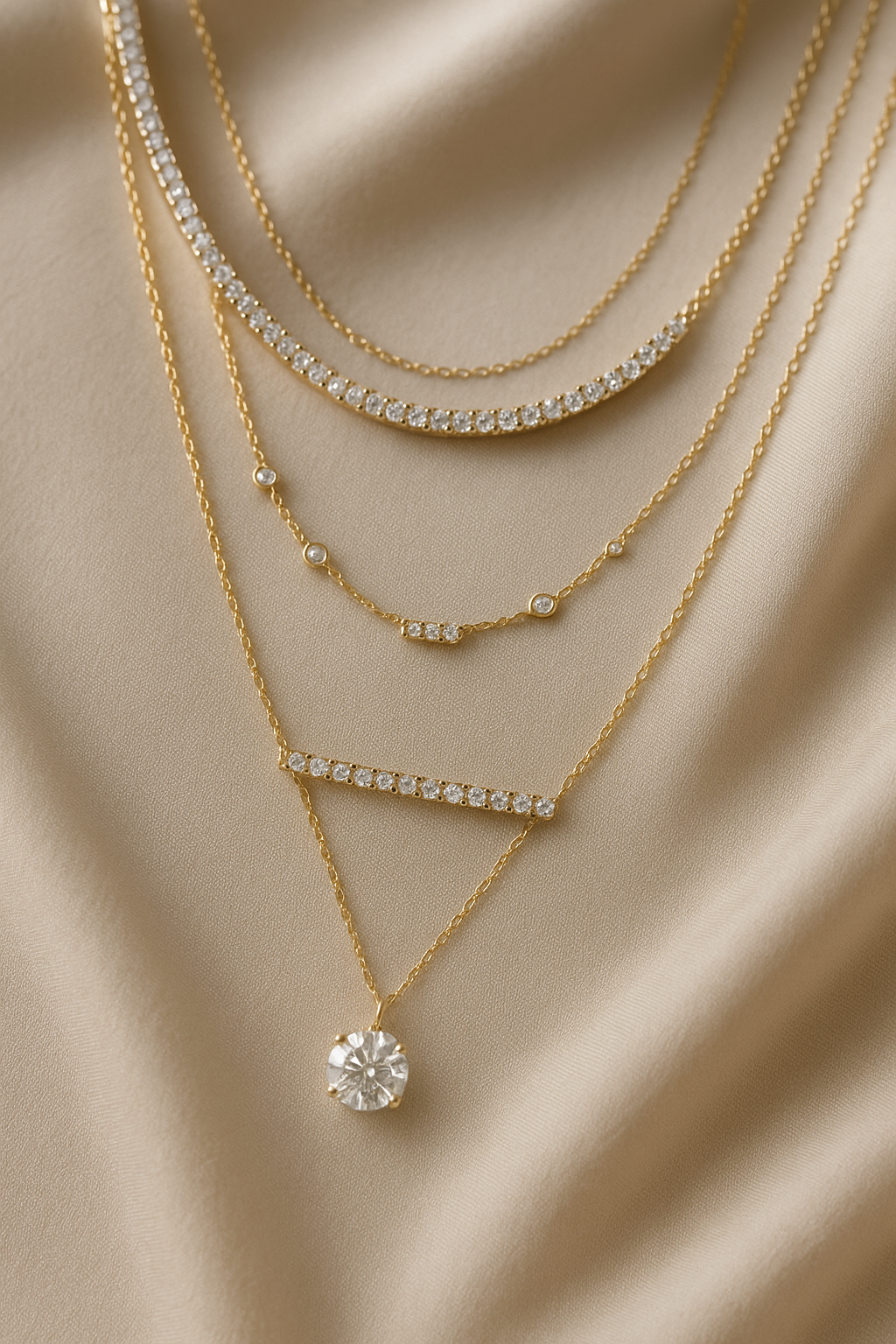 Varied lengths are the secret to visual flow. Each chain should rest at a distinct height — allowing each diamond to catch light independently.