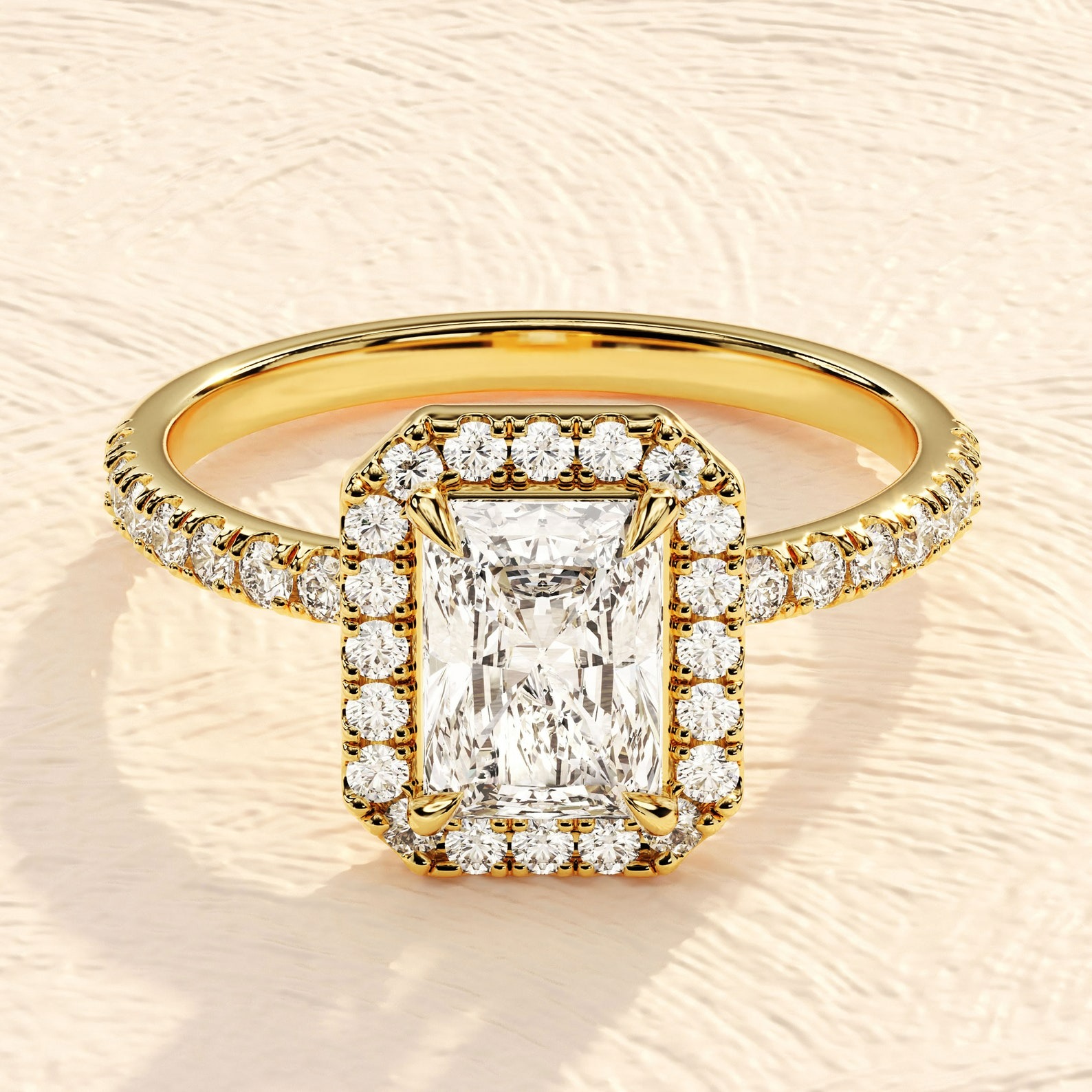 Bold and elegant 3.50ct emerald cut halo engagement ring featuring IGI-certified lab-grown diamonds, set in 14K solid gold for maximum brilliance.