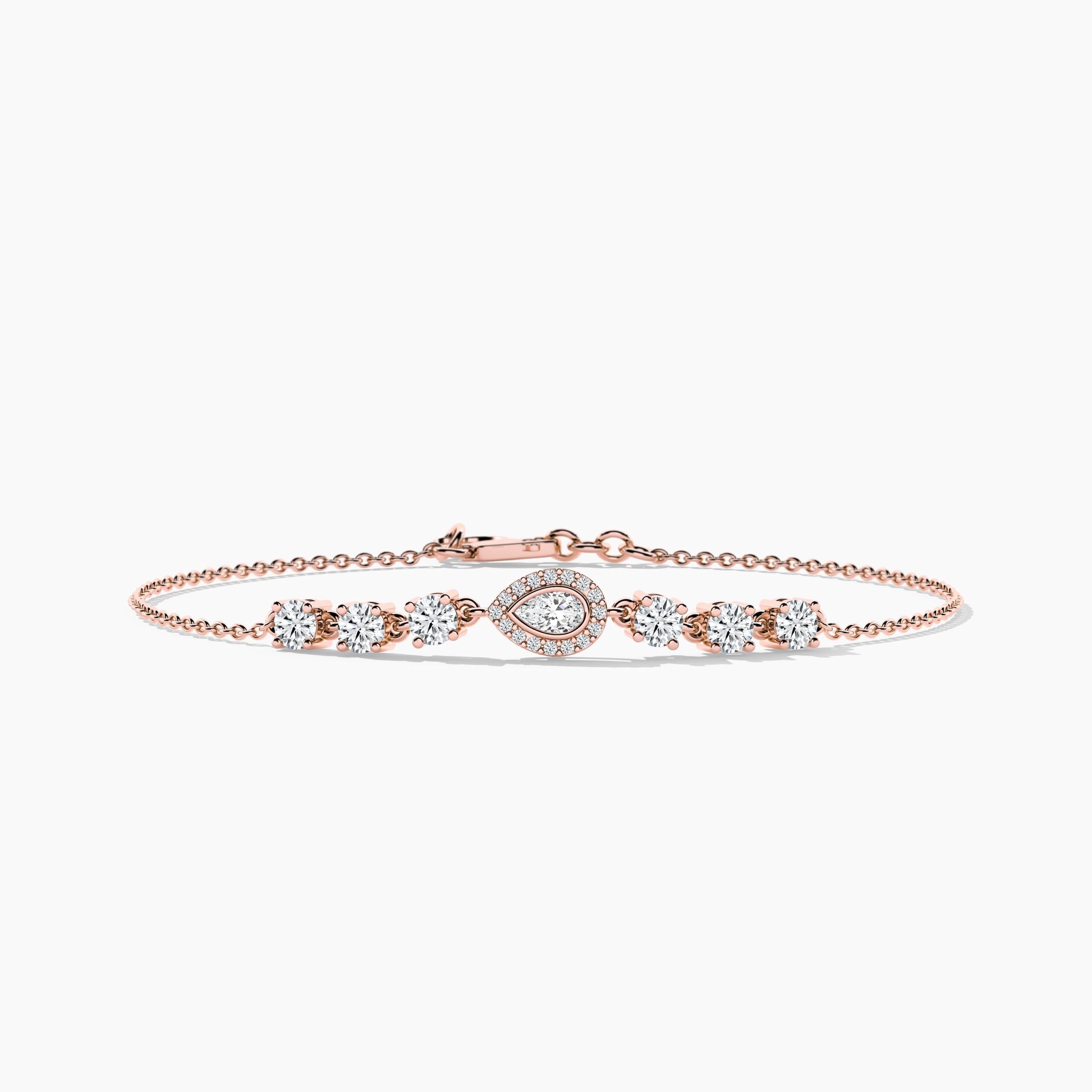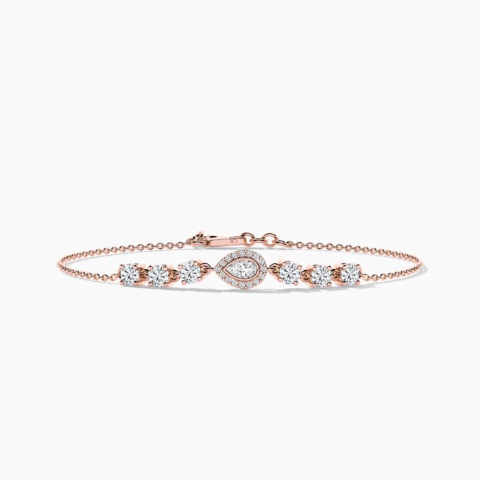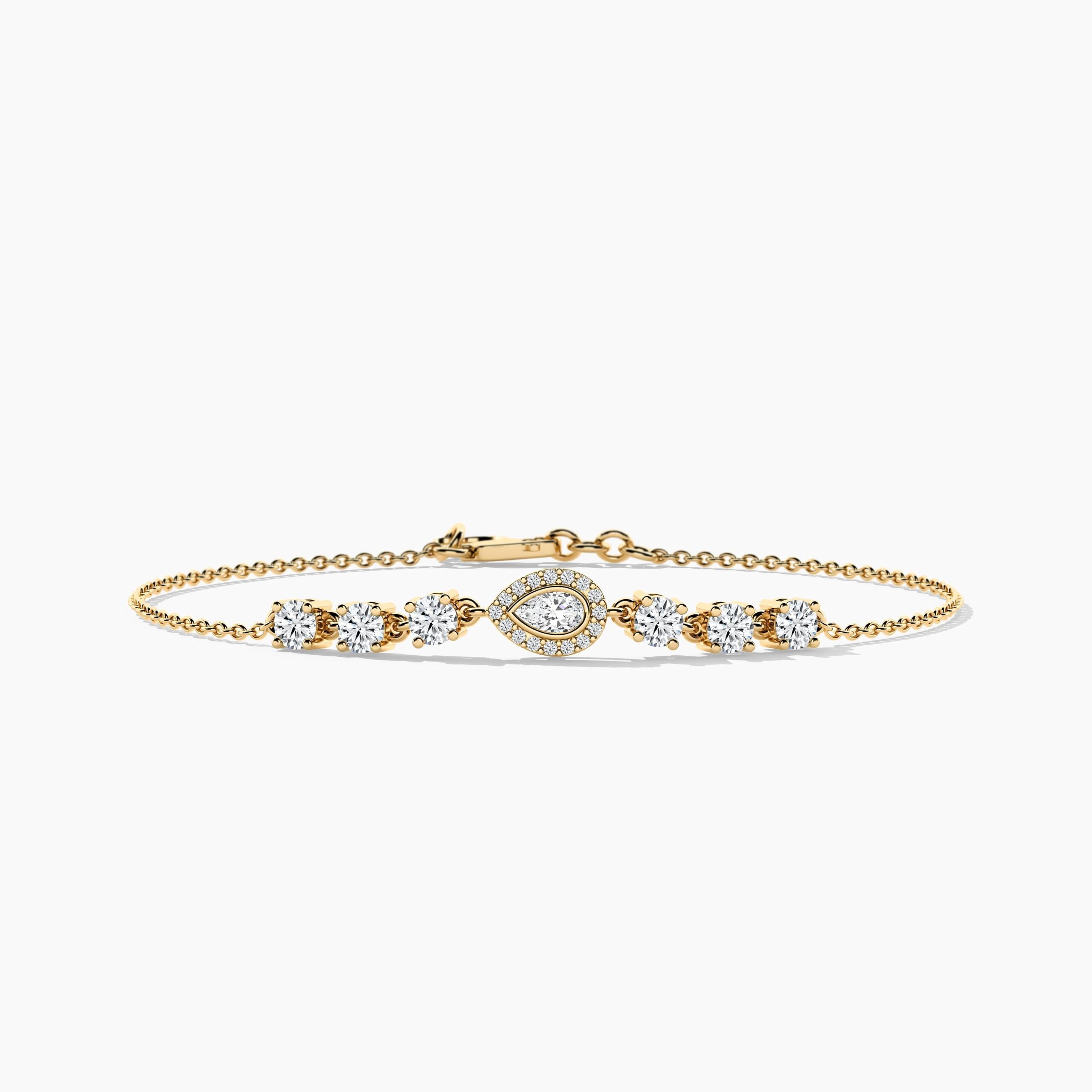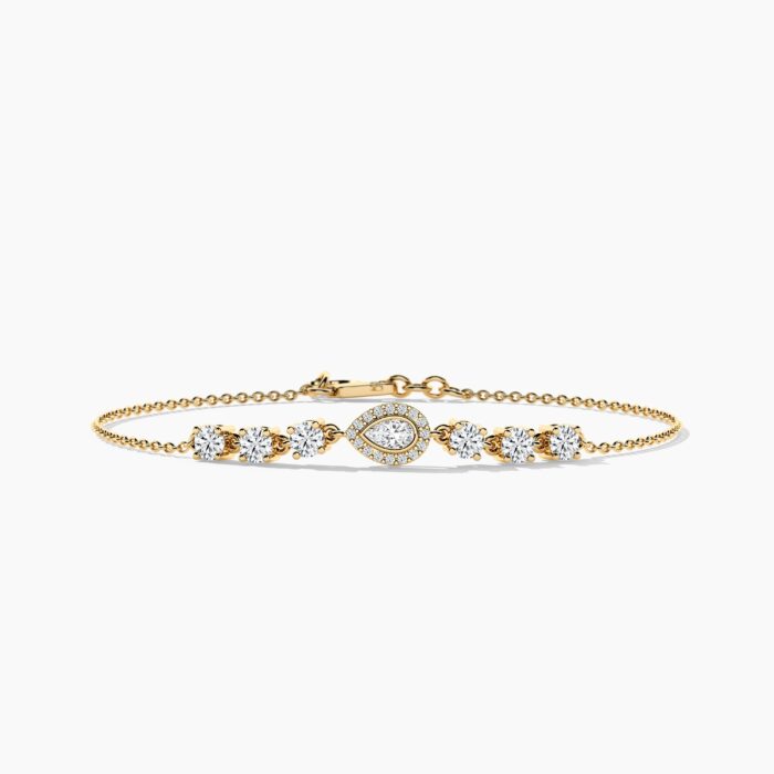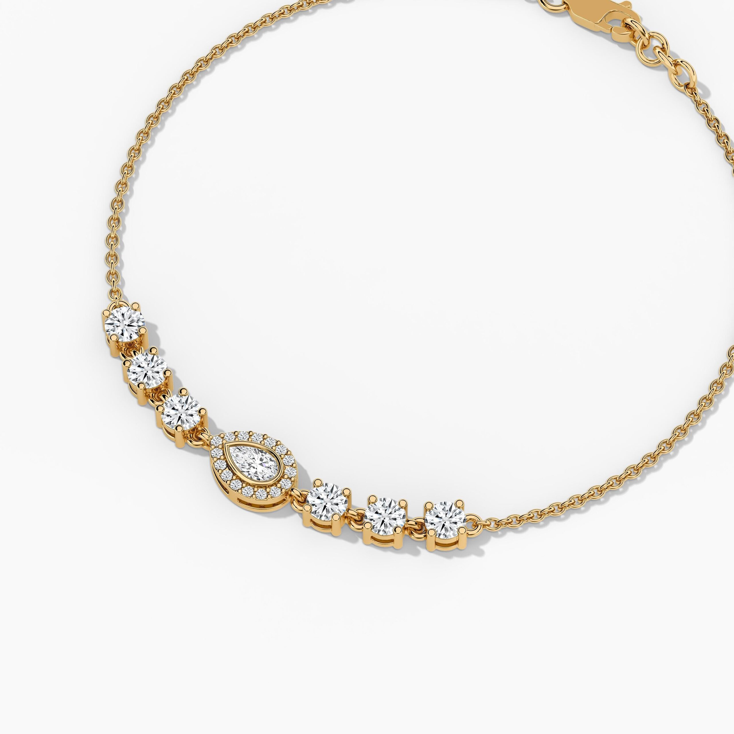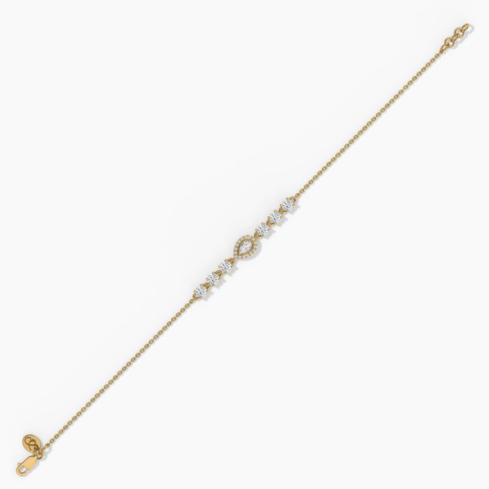 Crafted from 18K solid gold, this bracelet embodies timeless luxury while offering durability for everyday wear. At its center, a 0.25 Ct pear-shaped diamond takes prominence, radiating brilliance with EF color and VVS–VS clarity. Complementing it are round-cut diamonds of varying sizes, totaling 1.16 Ct, meticulously handset in prong settings to ensure maximum sparkle and secure placement. Together, the diamond arrangement brings the total weight to 1.41 Ct, giving the piece its radiant allure.