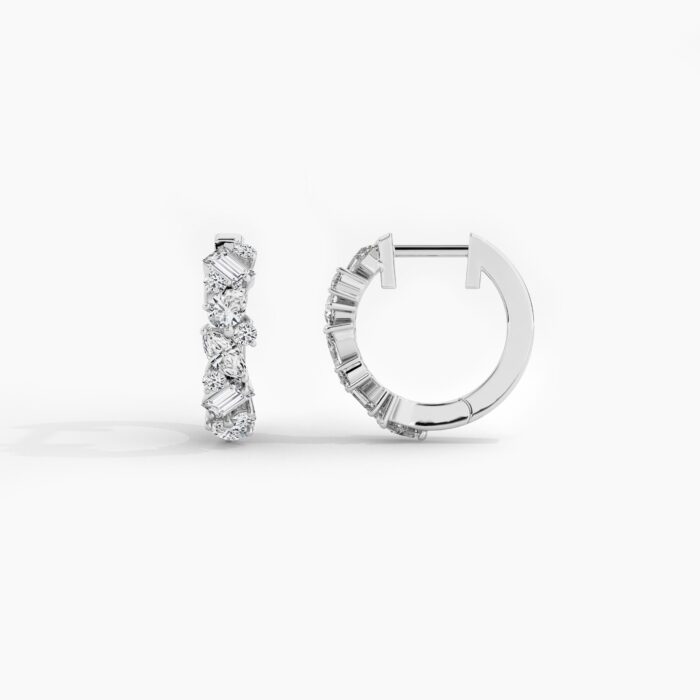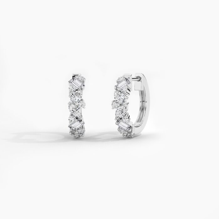 The carefully balanced combination of diamond cuts lends these hoops a refined yet contemporary edge. The baguettes provide sleek sophistication, the rounds add classic fire, the marquise diamonds contribute a touch of elegance, while the pear shapes bring graceful charm. Measuring 15mm in length, the earrings are designed to frame the face with subtle glamour, making them versatile enough for both everyday wear and evening occasions.