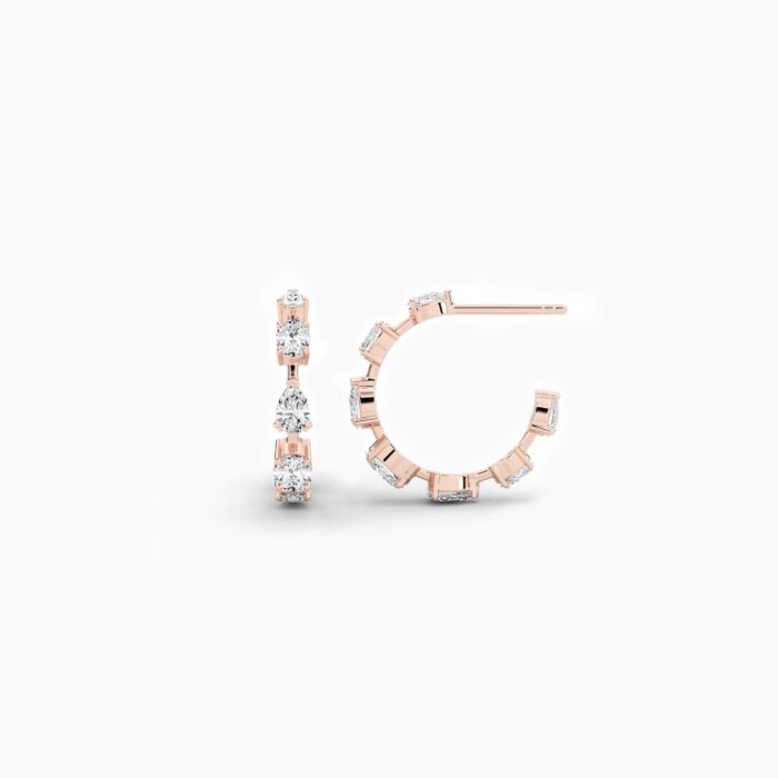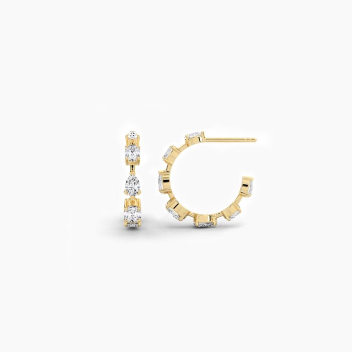 The 18K Solid Gold 2.23Ct Pear & Oval Diamond Hoop Earrings are an exquisite blend of modern artistry and timeless luxury. Carefully crafted in 18K solid gold, these hoops showcase a harmonious interplay of pear and oval-cut diamonds, arranged to maximize brilliance and elegance. With a total of 14 diamonds weighing 2.23 carats, each stone is meticulously selected for EF color and VVS–VS clarity, ensuring unmatched sparkle and sophistication.