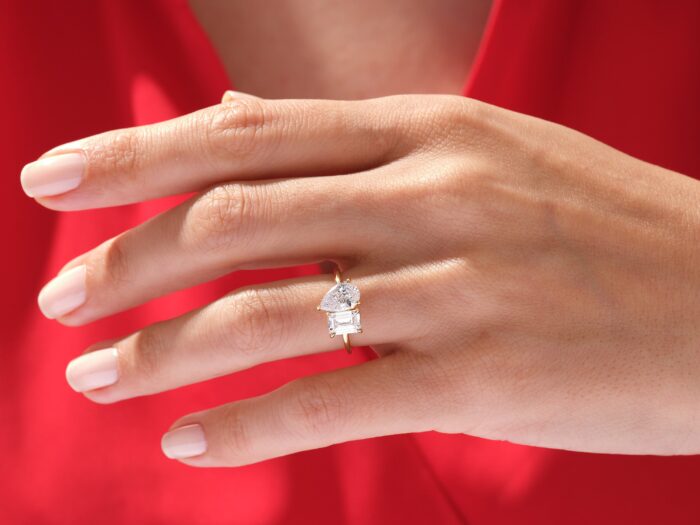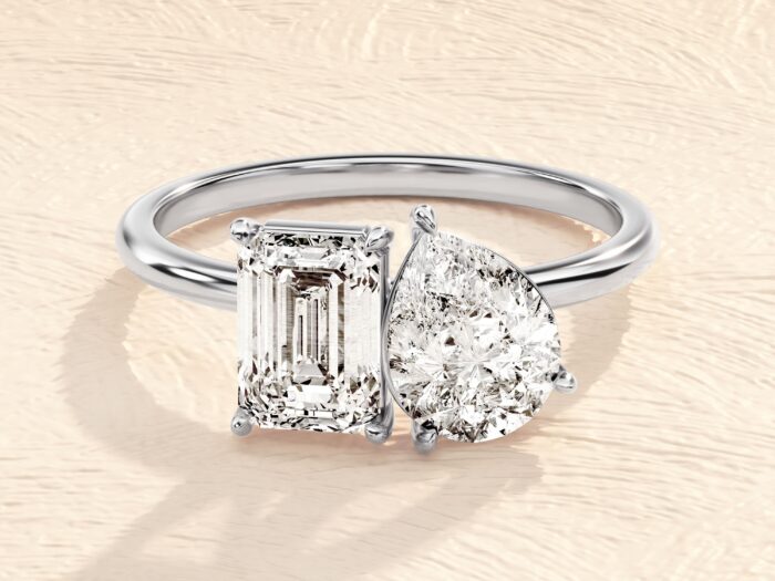 The 2.50 carat total weight showcases lab-grown diamonds of exceptional EF color and VVS–VS clarity, ensuring superior brilliance and fire. The contrasting shapes highlight one another beautifully, with the clean lines of the emerald cut balanced by the soft curves of the pear cut, creating a truly unique and symbolic engagement ring.