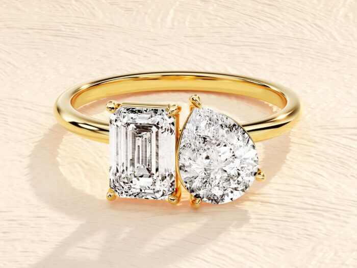 Elegant 18K Solid Gold Toi et Moi Ring with 2.50ct emerald & pear EF–VVS lab-grown diamonds. A symbolic and IGI-certified engagement ring.