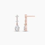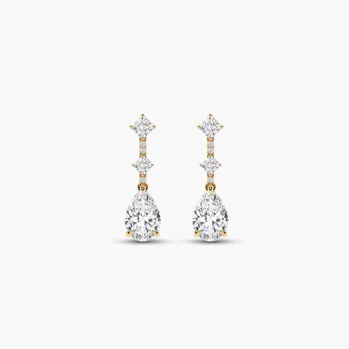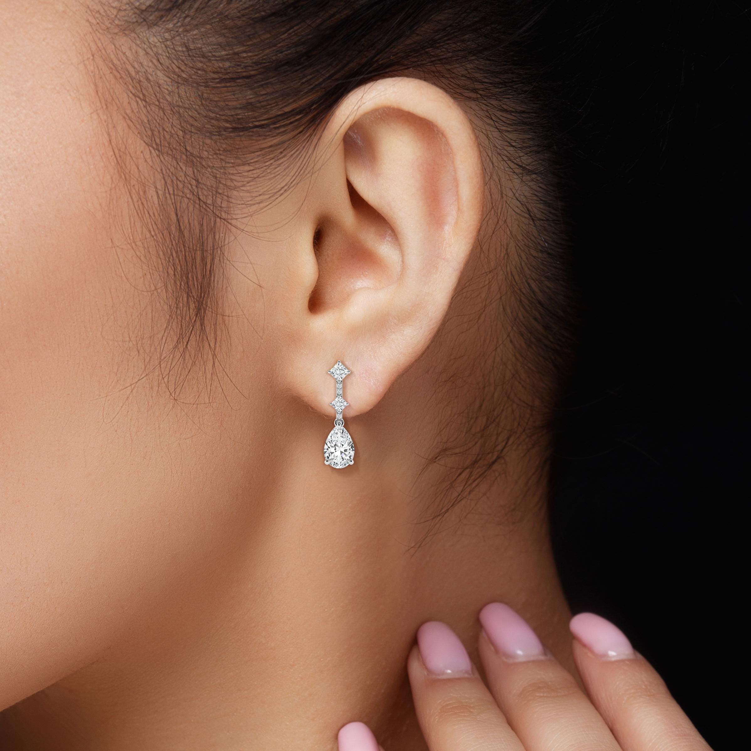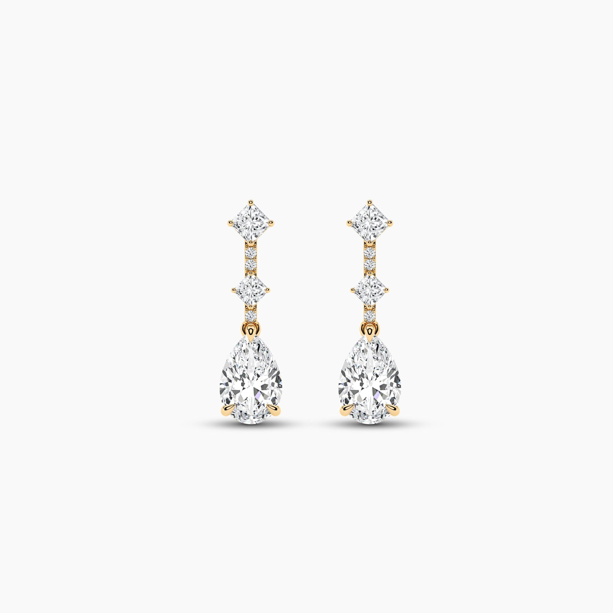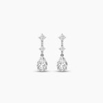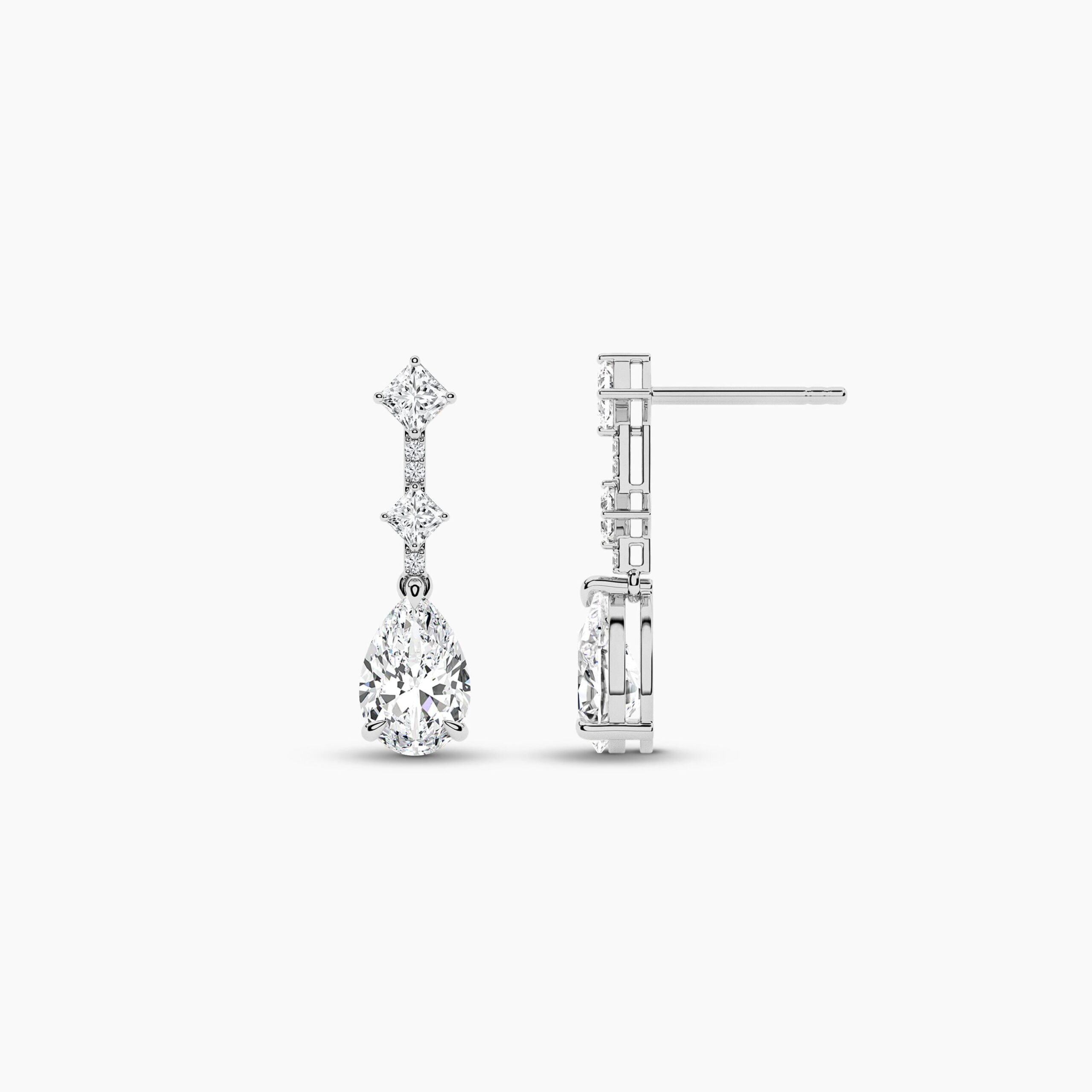 At the heart of each earring lies a magnificent pear-shaped diamond, measuring 9.00×6.00mm, radiating timeless sophistication with its elegant drop silhouette. Complementing this centerpiece are sparkling round diamonds and precisely cut princess stones, adding depth, fire, and modern artistry to the design. With a total carat weight of 2.61ct, each diamond is meticulously selected for its EF color and VVS–VS clarity, ensuring unmatched sparkle with every movement.